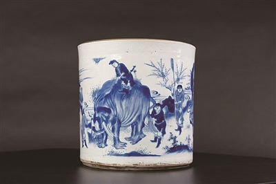 青花洗象图笔筒 明崇祯 ■北京艺术博物馆藏