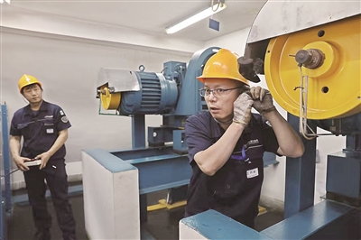 维保员正在对电梯设备进行“听声诊断” ■记者 董一鸣/摄
