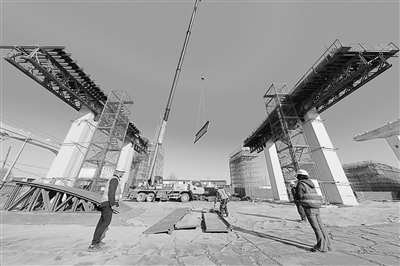 亮马河北路第七标段正在吊装混凝土模板。 ■记者 周宇杰/摄