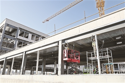 工作人员对机电主管线进行施工。 ■记者 董一鸣/摄