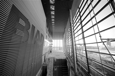 转到建筑北侧,由6根长度达27米的钢结构立柱撑起的一整面玻璃幕墙显得有些单薄。不过在设计师眼中,这6根钢柱却如同定海神针一样,将玻璃幕墙安全地固定在结构上。