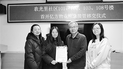 本报讯(记者 郭雨)近日,在朝阳区劲松街道农光里社区会议室内,一份物业服务移交清单由街道、社区与首开集团亿方物业公司三方代表共同签署完成,农光里社区101、102、103、108号楼正式移交首开亿方物业进行应急接管与服务。这4栋商品住宅楼的移交,标志着首开亿方物业实现了对该社区全部楼宇的物业服务全覆盖,一段从“应急补位”到“片区长效治理”的新探索就此开启。