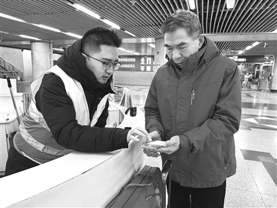 工作人员提供站内通行服务。 ■记者 刘偶/摄