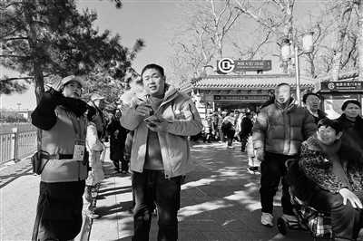 北京市商业学校学生志愿者(左一)正引导游人通行。 ■企业/供图