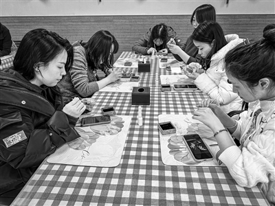 女职工们精心制作螺钿胸针。 ■企业/供图