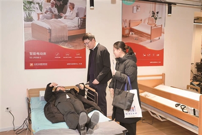 北京长城银发商店内,客户正在体验适老智能电动床。