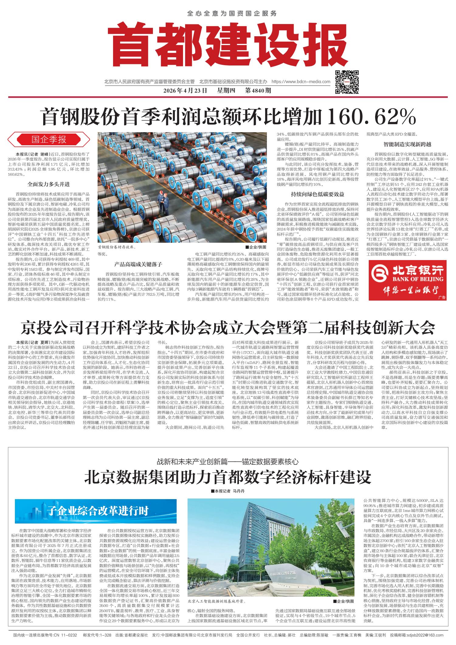 首钢股份首季利润总额环比增加160.62%
