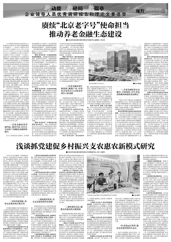 品牌文化是养老金融生态建设的内驱力。经过10年的养老金融工作积淀,北京农商银行创建了“金色时光”特色养老金融服务品牌,厚植了关怀关爱、暖心服务、长久陪伴的服务理念,也积累了丰富的服务经验。今年,北京农商银行全面梳理出台了养老金融工作方案,对养老金融工作进行高位部署和全面升级,继续丰富产品服务内涵,推动金融服务贯通代际、赋能产业、融入生态,以更大作为助推老年友好型社会建设,营造养老孝老敬老社会氛围。
