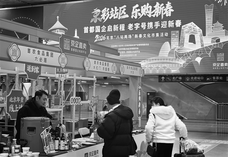 在北京西站,新春大集同样人气十足。北广场地下二层,全聚德、稻香村、义利、北冰洋、御食园等十多家老字号与北京品牌汇聚一堂,推出各类糕点、熟食、饮品及特色“京味儿”礼品集合,方便旅客一站式采购。据了解,京企直卖在西站还同步开通了线上购买渠道,旅客扫码进入“京企直卖”平台,选好心仪商品后可直接填写地址邮寄到家,实现“空手”逛集、轻松返乡。