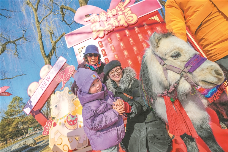 新春系列活动期间,北京野生动物园围绕马年主题,推出“马年纳福集戳打卡”“马年生肖揭牌仪式”“马科动物科普小课堂”等特色活动,让游客在参与中了解生肖文化、学习动物知识。游客在三大广场同步举办的年味游园会上不仅可以参与游戏,还能免费体验红包墙抽奖、领取动物图案限定胸章等互动环节。